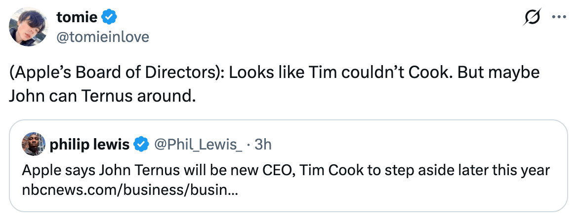 Also, the LinkedIn profile of new Apple CEO John Ternus.